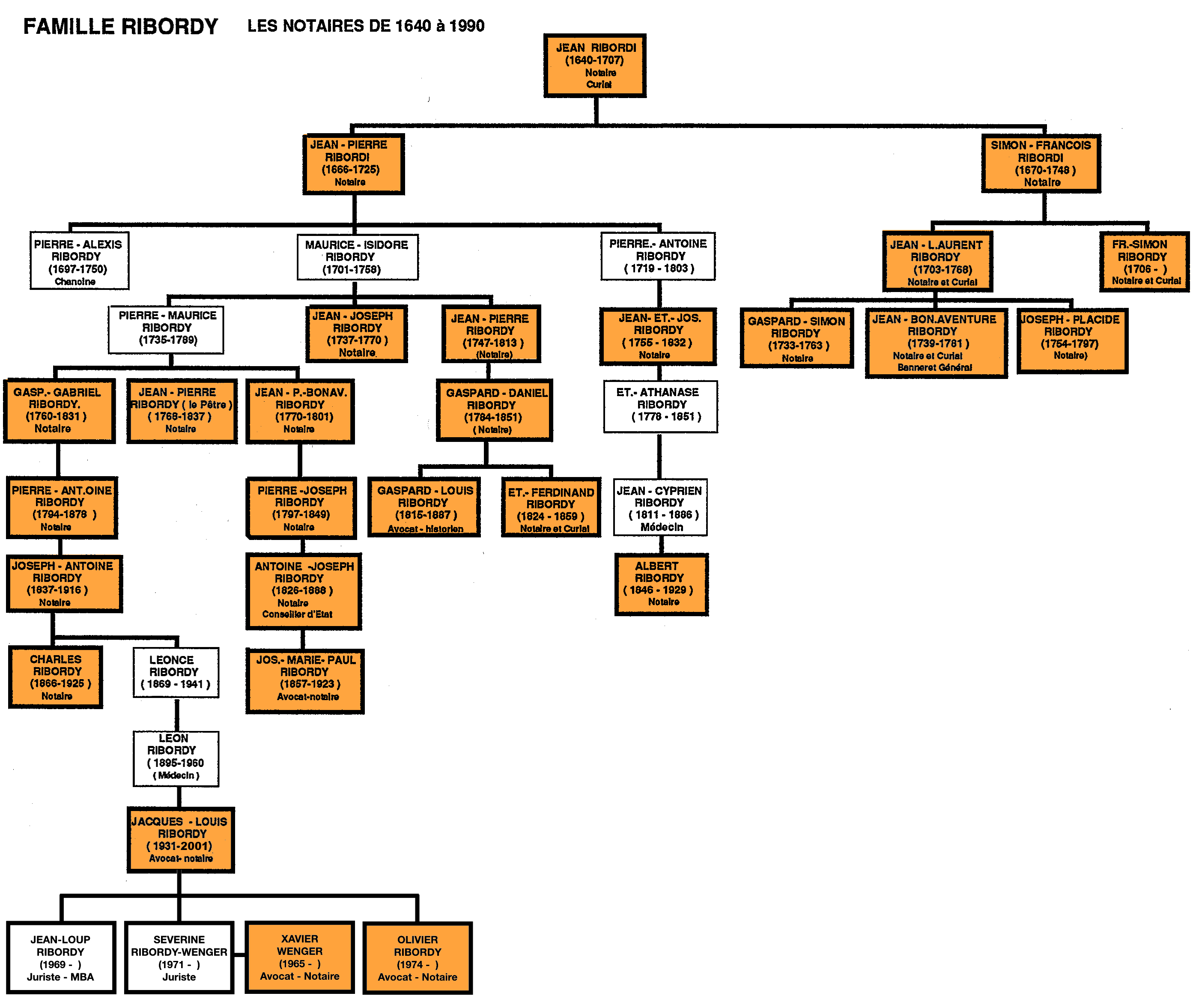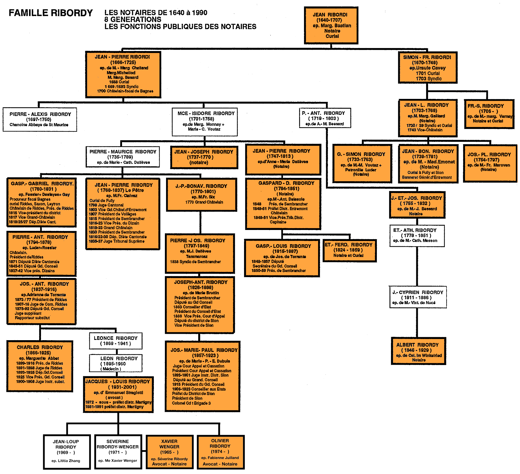 Dans son étude, Françoy Raynauld a constaté que dans la commune de Bagnes, " des rapports de parenté se sont formés parmi les notaires. Les liens qui se créent peuvent servir d'indicateur d'une certaine aisance qui distingue les notaires du reste de la population : en effet, les familles de notaires se reconnaissent, au moins entre elles, un statut particulier; une éventuelle endogamie professionnelle reflète une certaine prise de conscience d'intérêts communs et, comme chez les paysans, on veut conserver son patrimoine à l'intérieur de la famille; dans cette optique la constitution de familles de notaires est certes un moyen efficace ". Il en fut de même à Sembrancher. Jean VII Ribordi (1640-1707) épousa Marguerite Bastian, son fils Jean-Pierre Ribordy (1666-1725) épousa à son tour Marie-Marguerite Challand, qui appartenaient toutes deux à d'importantes familles de notaires, qui détenaient les métralies de Liddes et de Bourg-Saint-Pierre. La généalogie de la famille Ribordy a multiplié les alliances avec les familles Dallèves, Voutaz, Delasoie etc. Elles furent toutes alliées aux Fabri, de Loës, Medici, Volluz, qui comptaient également de nombreux notaires. Sans compter Antoine II et Jean III qui furent clercs et notaires au XVIème siècle, on dénombre à ce jour, dans la seule descendance de Jean VII Ribordi, né en 1640, 26 notaires portant le même patronyme qui se sont établis successivement à Sembrancher, Bagnes, Riddes, Sion ou Martigny et qui ont presque tous occupé des fonctions politiques ou judiciaires à tous les niveaux (cf: Arbre généalogique).